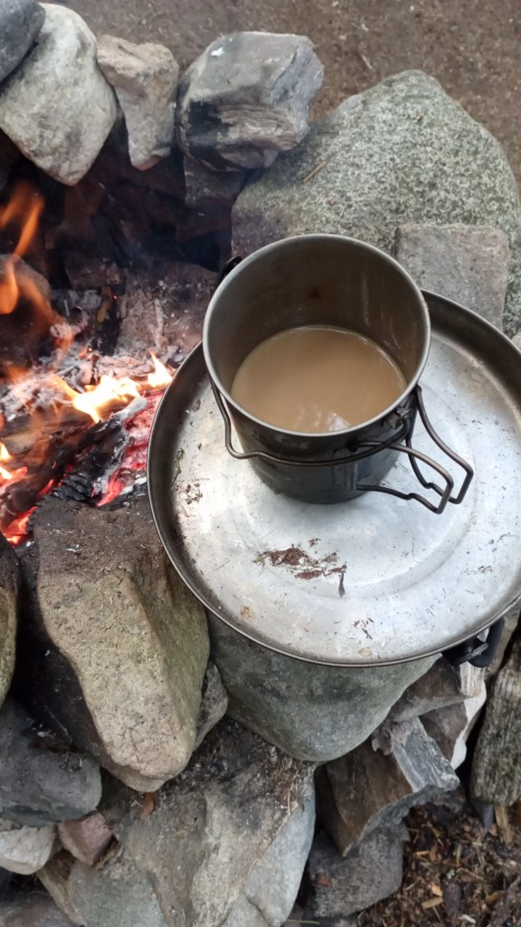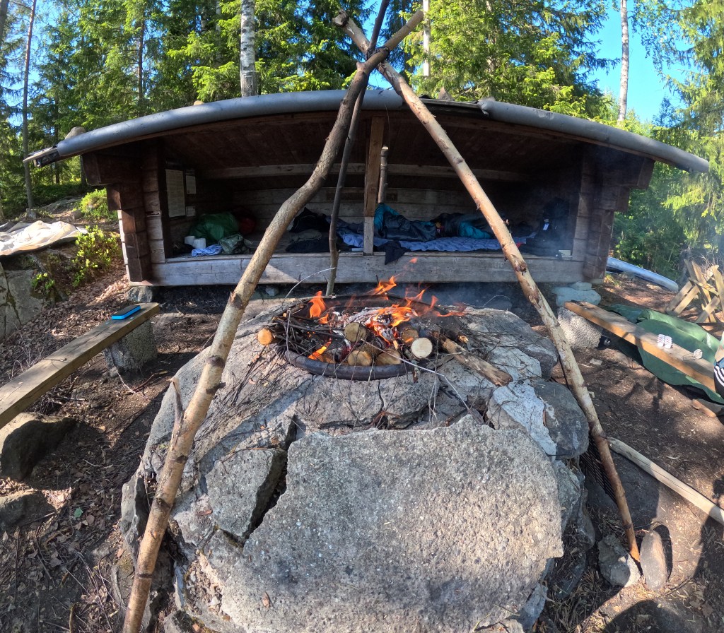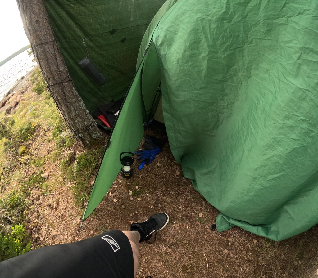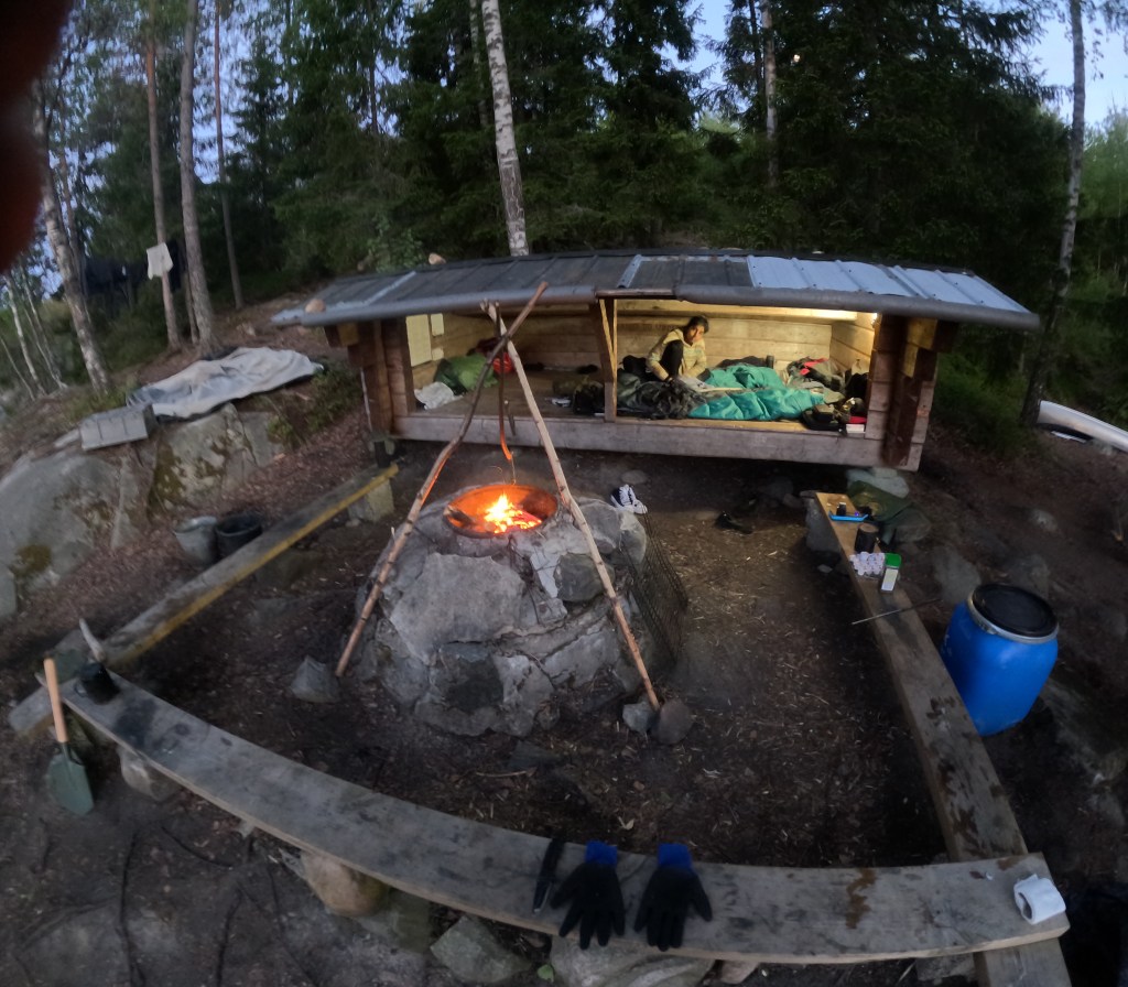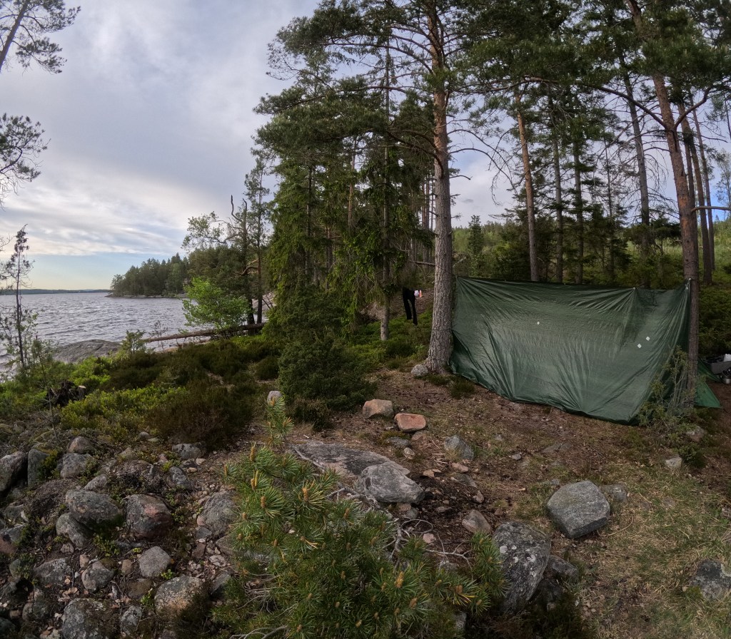 Nach einer unerwarteten Notlandung wechselten wir die Plätze – ich fand mich nun hinten wieder und übernahm das Steuer, während meine Freundin an einem vollkommen windstillen Tag den Wunsch verspürte, es erneut zu versuchen. Wir machten uns auf die Suche nach einem abgelegenen Stück Wald, wo wir unser Zelt aufschlagen konnten, und errichteten unser Lager an diesem idyllischen Ort. Mit unserem Hobo-Ofen und der feuerfesten Matte als Unterlage entzündeten wir ein wärmendes Feuer und bereiteten ein einfaches, aber herzhaftes Mahl zu. Die erste Etappe hatte sich als sehr anstrengend herausgestellt, weshalb wir uns früh zur Ruhe begaben.