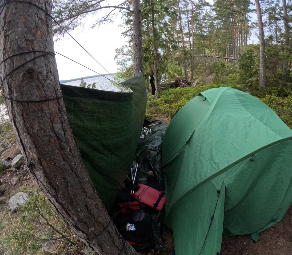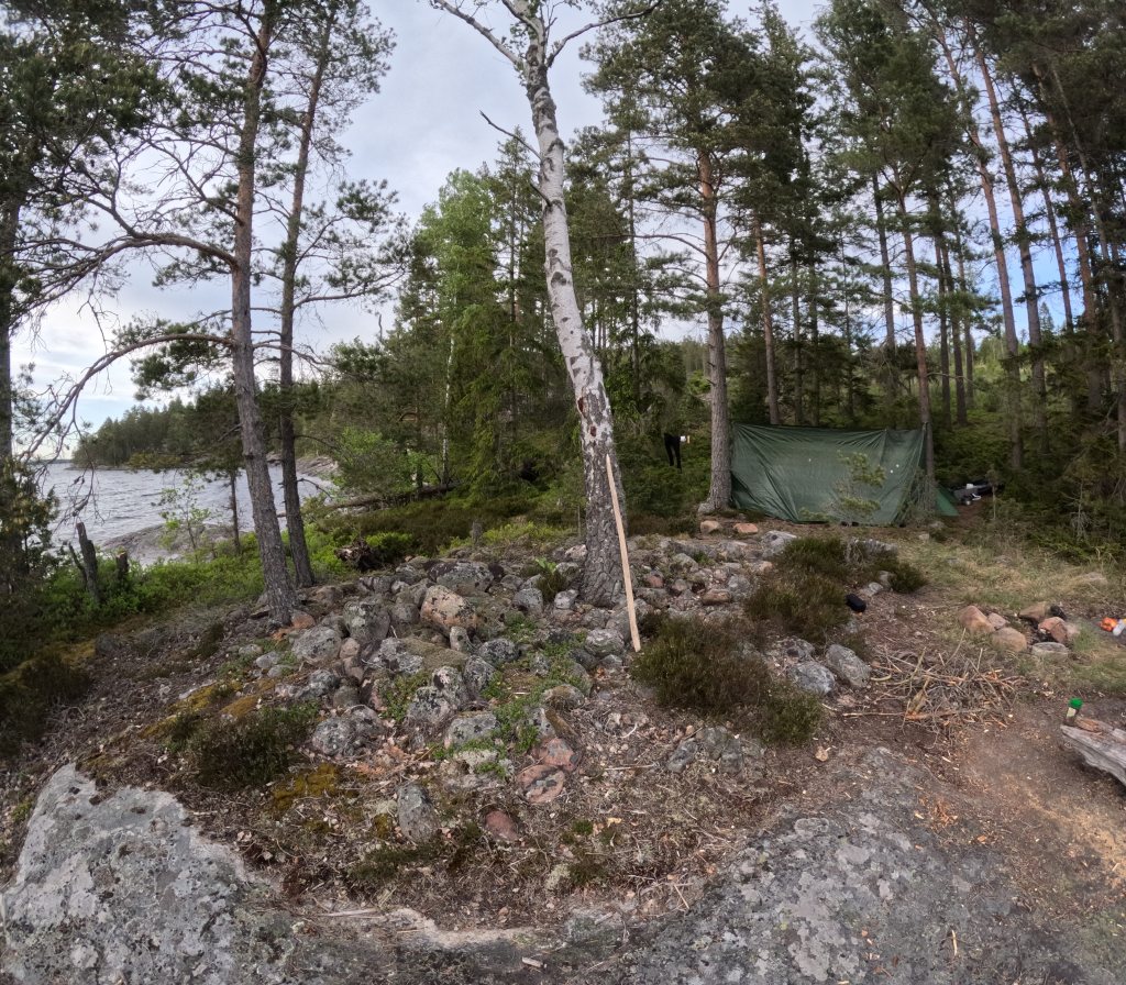 Am Tag zwei lachten wir über die Erlebnisse des Vortages und beschlossen, unser Glück an einem passenden Lagerplatz zu versuchen. Doch das Wetter wollte uns einen Strich durch die Rechnung machen, und so überquerten wir unter großen Mühen den See ein zweites Mal in Richtung Nordosten, was alles andere als ungefährlich war, um schließlich einen geeigneten Platz zu finden. Am Ende der Reise offenbarte sich dieser unberührte Lagerplatz als einer der schönsten, auch wenn der Untergrund etwas steinig war.